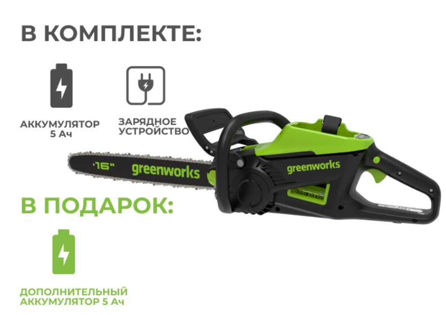 Пила цепная аккумуляторная Greenworks GD60CS25 60В (2 АКБ 5Ач + ЗУ)