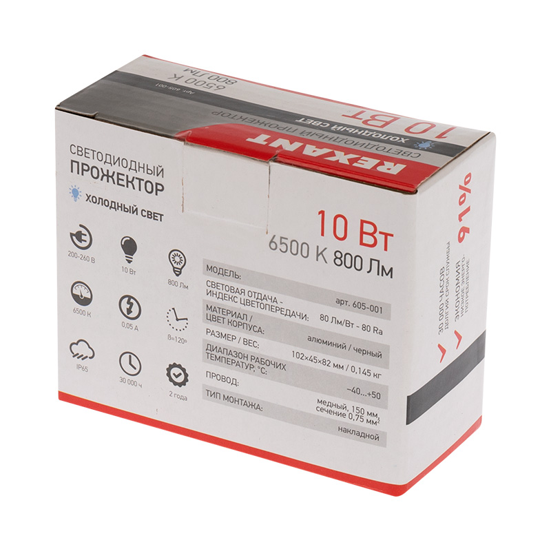 Прожектор светодиодный 10 Вт 200–260В IP65 800 лм 6500 K холодный свет REXANTБольшая гарантия - 2 годаКомпактные размерыСамый ликвидный ассортиментНаличие артикулов с датчиками движенияВысокая цветопередача и светоодааВысокий коэфицент мощностиНоминальная мощность, Вт: 10Номинальное напряжение, В: 230Частота сети, Гц, В: 50Диапазон рабочих напряжений, В: 200-260Рабочий ток, А: 0,05Цветовая температура, К: 6500Световой поток, Лм: 800Световая отдача, Лм/Вт: 80Угол рассеивания, град: 120Индекс цветопередачи, Ra: 80Класс защиты, IP: 65Коэффициент мощности, cosϕ: 0,9Класс энергоэффективности: AТип кривой силы света: ДМинимальное расстояние до освещаемого объекта, м: 1Освещаемая площадь (15 люкс), м2: 50Высота монтажа (для получения 15 люкс на поверхности), м: 4Тип монтажа: накладнойМатериал шнура: медь Длина шнура, мм: 150 Сечение шнура: 0,75 м2Тип источника питания: встроенныйОбъём, метр кубический: 0,00038Наличие датчика движения: НетМатериал корпуса: алюминийЦвет корпуса: черныйДлина, мм: 102Ширина, мм: 45Высота, мм: 82Вес, кг: 0,145