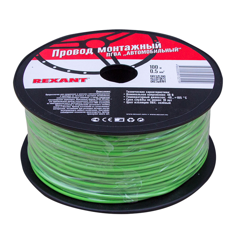 Провод ПГВА REXANT предназначен для гибкого соединения автотракторного электрооборудования и приборов с номинальным напряжением до 48 В, изготавливается для автомобильной проводки и элементов питания и управления. Состоит из многожильной токопроводящей жилы с поливинилхлоридной изоляцией. Расшифровка провод ПГВА: П — Провод Г — Гибкий В — Изоляция из поливинилхлоридного пластикатаА — Автотракторный Технические характеристики:Номинальное напряжение: до 48 ВЭлектрическое сопротивление изоляции на длине 1 км: не менее 3,0 мОмИзоляция жилы: из ПВХ пластикатаРасцветка провода имеет сплошную расцветкуКласс гибкости: 3Минимальный радиус изгиба: не менее 10-кратного значения минимального размера проводаПредельно допустимая рабочая температура: –50...+70 °ССрок службы: 15 лет