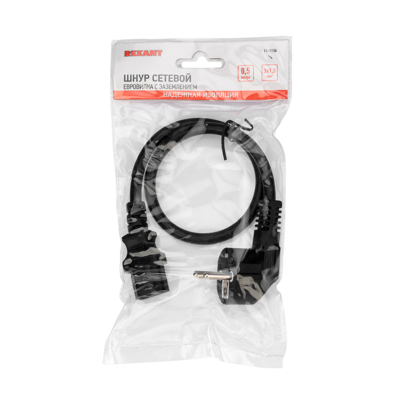 Шнур сетевой евро 1,5 мм² 0,5 м (PVC) (с заземлением) для подключения к сети переменного тока с напряжением 220 B блоков электропитания и телекоммуникационных шкафах и стойках, майнинг оборудования, стационарных персональных компьютеров, мониторов, ИБП, принтеров и других периферийных устройств с штыревым разъемом C14.Также шнур сетевой евро (IEC cord) используется для питания многих видов электроприборов, например, усилителей для электронных музыкальных инструментов и профессионального звукового оборудования. Данный шнур IEC оснащен с одной стороны неразборной литой вилкой (евростандарт) с заземляющим контактом, с другой — литым трехконтактным гнездовым разъемом C13 и трехжильным проводом с сечением жил 1,5 мм². Основные характеристики:Тип вилки: евроТип розетки: IEC (С13)Изоляция жил и общая оболочка: ПВХДлина провода: 0,5 мШнур имеет многопроволочные жилы, заключенные в эластичную двойную изоляцию из ПВХ, что делает его максимально гибким и увеличивает срок эксплуатации изделия.