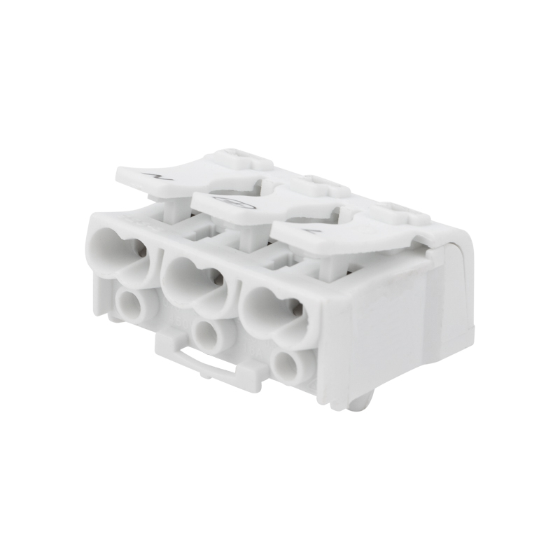 Пружинные трехполюсные клеммы с монтажными ножками REXANT предназначены для присоединения и ответвления одножильных и многожильных медных проводников в электрических цепях переменного тока напряжением до 450 В. Наличие маркировки («фаза», «ноль», «земля») на подвижной части зажима, наличие монтажной ножки. Материал корпуса – самозатухающий ПВХ, материал контакта – электротехническая сталь.