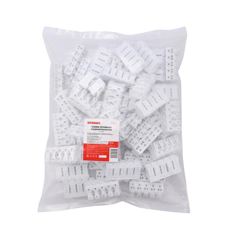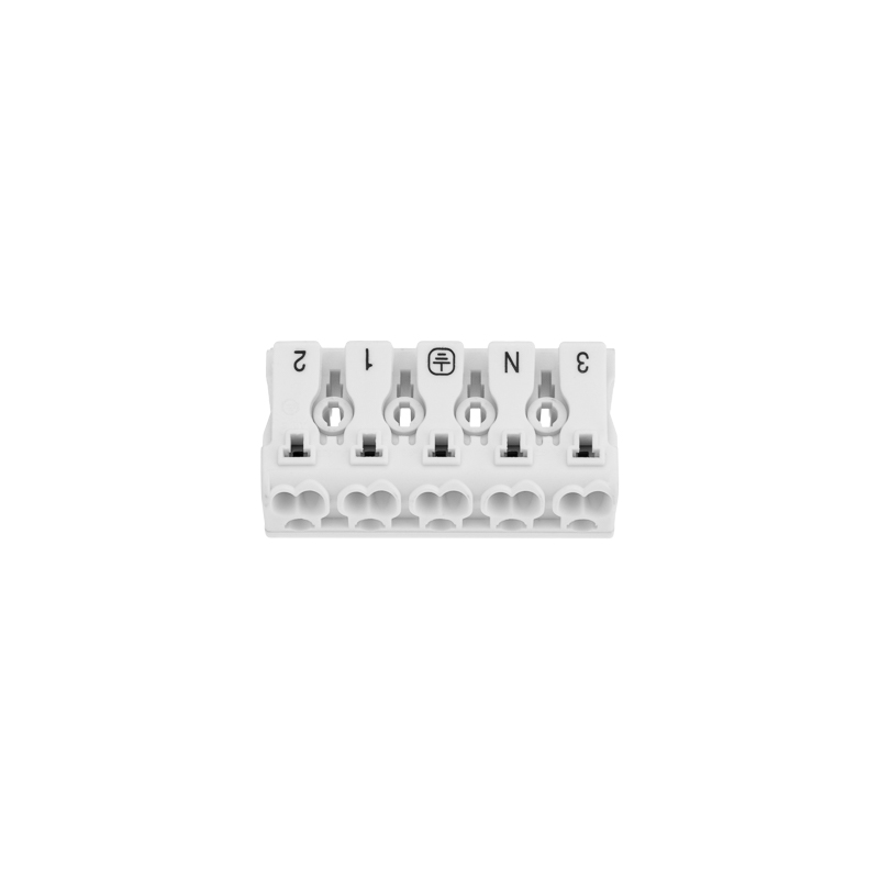 Пружинные пятиполюсные клеммы REXANT предназначены для присоединения и ответвления одножильных и многожильных медных проводников в электрических цепях переменного тока напряжением до 450 В. Наличие маркировки («фаза», «ноль», «земля») на подвижной части зажима. Материал корпуса – самозатухающий ПВХ, материал контакта – электротехническая сталь.