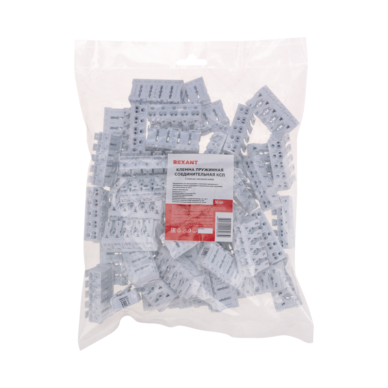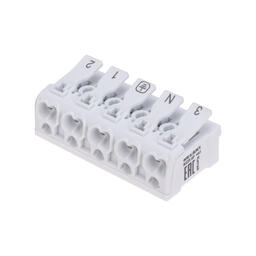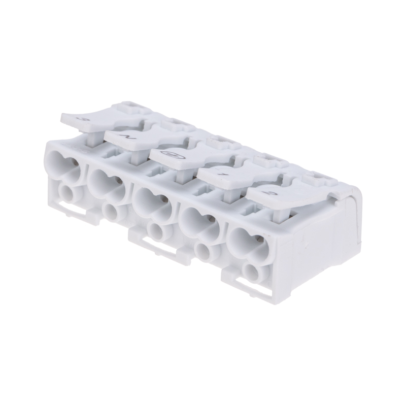 Пружинные пятиполюсные клеммы с монтажными ножками REXANT предназначены для присоединения и ответвления одножильных и многожильных медных проводников в электрических цепях переменного тока напряжением до 450 В. Наличие маркировки («фаза», «ноль», «земля») на подвижной части зажима, наличие монтажной ножки. Материал корпуса – самозатухающий ПВХ, материал контакта – электротехническая сталь.