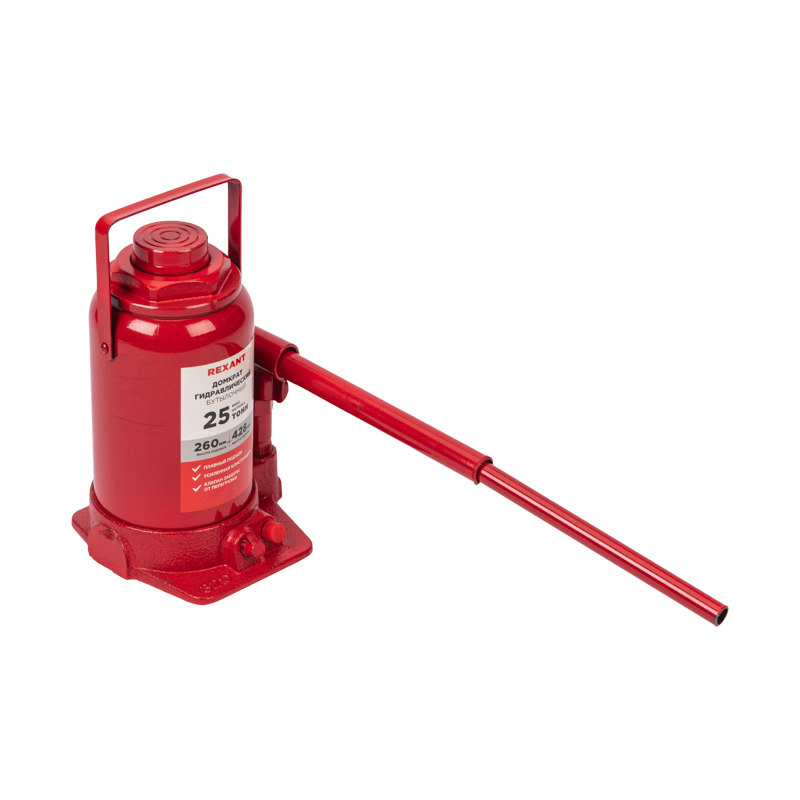 Гидравлический бутылочный домкрат 25 т Rexant поднимает грузы массой до 25 тонн на высоту до 360 мм. Оптимален для автомобилей с большим клиренсом. Будет полезен автолюбителям при проведении технического обслуживания и ремонта, а также для профессионалов на СТО. Отличается плавностью хода, надежностью и жесткостью конструкции.