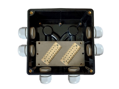 Материал - ударопрочный пластик толщиной 5 мм, IP66/67, крепление крышки саморезом, винтовой клеммник (4мм.кв) 16 шт (штатно), штатно 4 гермоввода ПКВ20х1,5 для подключении кабеля Ø 6-14 мм. По требованию Заказчика дополнительно комплектуется кабельными вводами диаметром от 12 до 32 мм2, с возможностью подключения всех существующих видов кабельной прокладки, шин заземления и проходных клемм от 0,1 до 10 мм2.