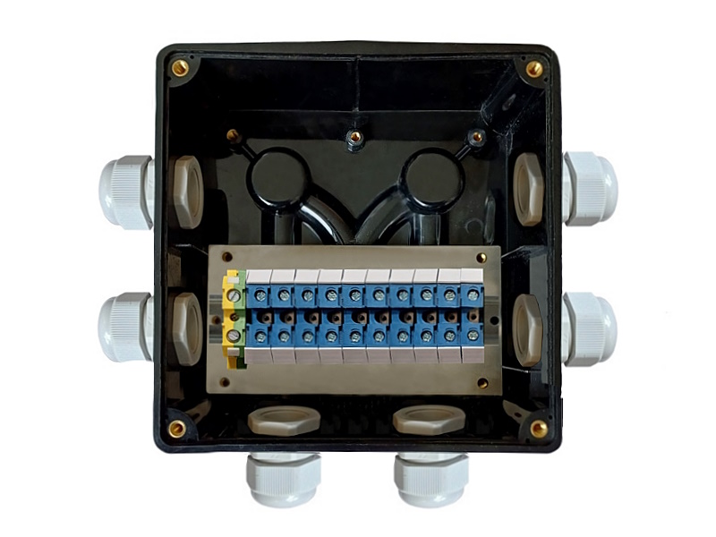 Материал - ударопрочный пластик толщиной 5 мм, IP66/67, винтовое крепление крышки, самозажимной клеммник (10мм.кв) 14 шт (штатно), штатно 4 гермоввода ПКВ20х1,5 для подключении кабеля Ø 6-14 мм. По требованию Заказчика дополнительно комплектуется кабельными вводами диаметром от 12 до 32 мм2, с возможностью подключения всех существующих видов кабельной прокладки, шин заземления и проходных клемм от 0,1 до 10 мм2.