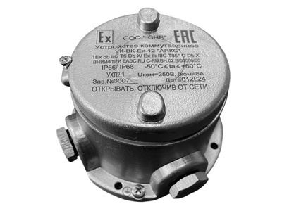 Взрывозащищенное устройство управления и коммутации, два реле, контакты на переключение. U-упр.12 В, I-упр.55 мА, U-коммут.до 250В, I-коммут.до 8 А; t-раб.-50...+60°С, Ø117 х 85 мм, 1,3 кг , IP66/IP68, 1EX DB IIC T6 DB Х / EX TB IIIC T85°C DB Х. До 3 кабельных ввода или Ех-заглушек (приобретаются отдельно).