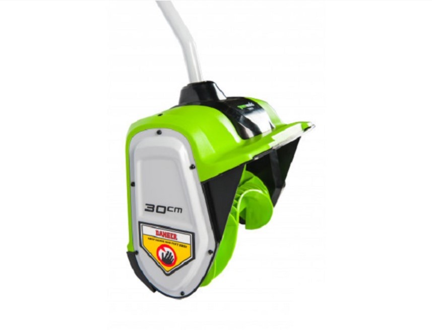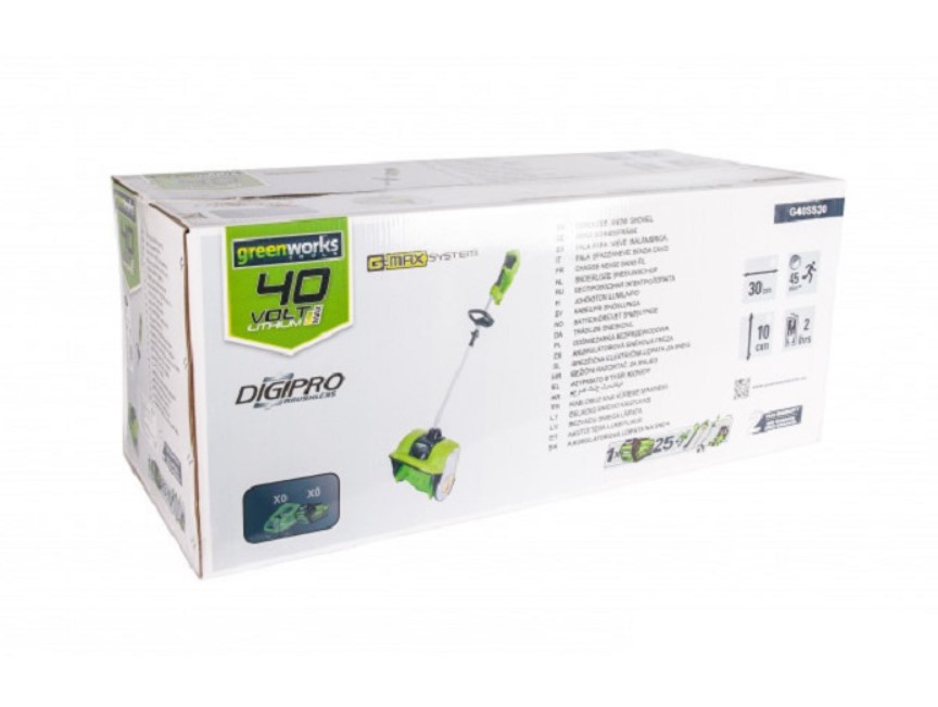 Снегоуборщик оснащен системой защиты от случайного включения и дополнительной ручкой для крепкого хвата. Как уже было отмечено снегоуборщик входит в серию 40V и работает от аккумуляторных батарей G-MAX 40V.