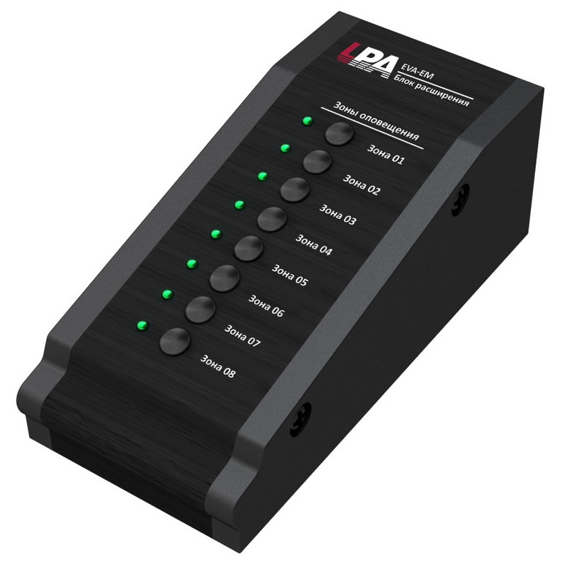 Блок расширения микрофонной консоли на 8 зон LPA-EVA-EM предназначен для управления и индикации состояния дополнительного количества зон / групп оповещения микрофонных консолей LPA-EVA-FM / LPA-EVA-RM.