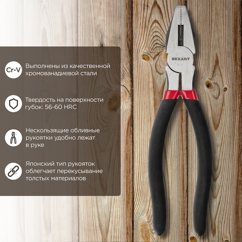 Плоскогубцы комбинированные REXANT 200 мм предназначены для проведения точных работ, а также для монтажа слаботочных цепей. Подходят как для профессиональных работ, так и для бытового применения. Инструмент изготовлен из высокоуглеродистой стали. Губки инструмента закалены, что значительно увеличивает рабочий ресурс инструмента.Специальная форма облегченных рукояток обеспечивает дополнительный комфорт при работе. Небольшие размеры инструмента позволяют выполнять работу в труднодоступных местах.Хром-ванадиевый сплав (Chrome Vanadium) CrV, из которого изготовлен инструмент, обладает такими свойствами, как прочность, жесткость и устойчивость к износу. Во время прокаливания он менее подвержен деформациям и потере первоначальной формы, чем другие типы инструментальной стали. Технические характеристики: Материал рабочей части: высокоуглеродистая сталь CrV Твердость на поверхности плоскогубцев: ≥48 HRCТвердость на поверхности губ плоскогубцев: 58-62 HRCОблегченные рукояткиСпособ обработки: закалкаДлина инструмента: 200 ммМатериал рукояток: ПВХ