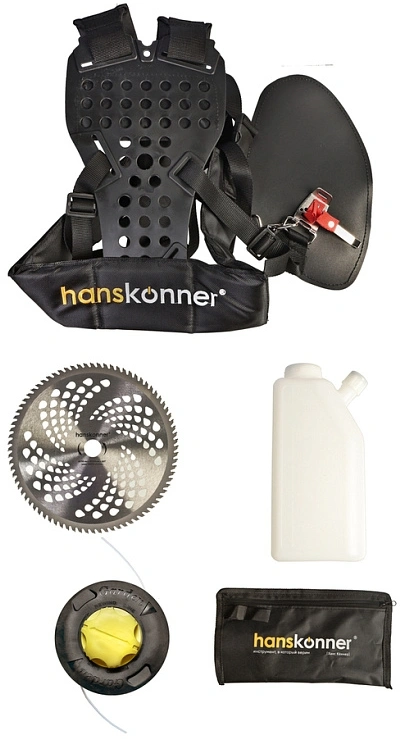 Комплект поставкиТриммер бензиновый (двигатель с ручкой газа и штанга),Боковая рукоятка,Катушка с нейлоновой леской,Ранцевый ремень ремень,Канистра для топливной смеси,Защитный кожух,Отвертка с торцевым ключом,Шестигранный ключ,Сумка для инструментов,Фреза 80Т,Инструкция по эксплуатации,Инструкция по безопасности