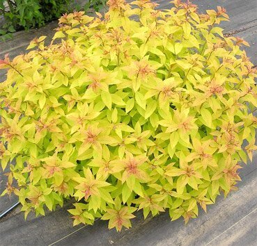 - Название сорта Goldflame (Спирея)