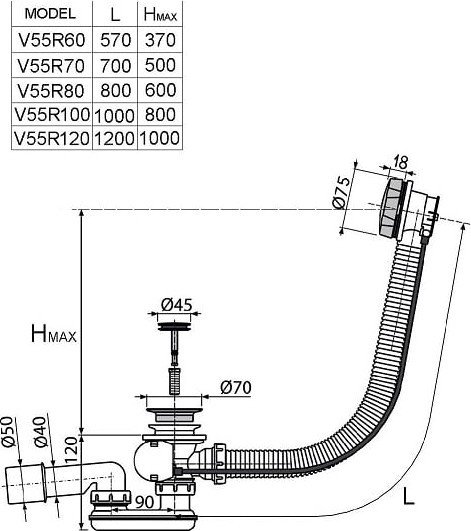 - Диаметр сливного отверстия 52 мм