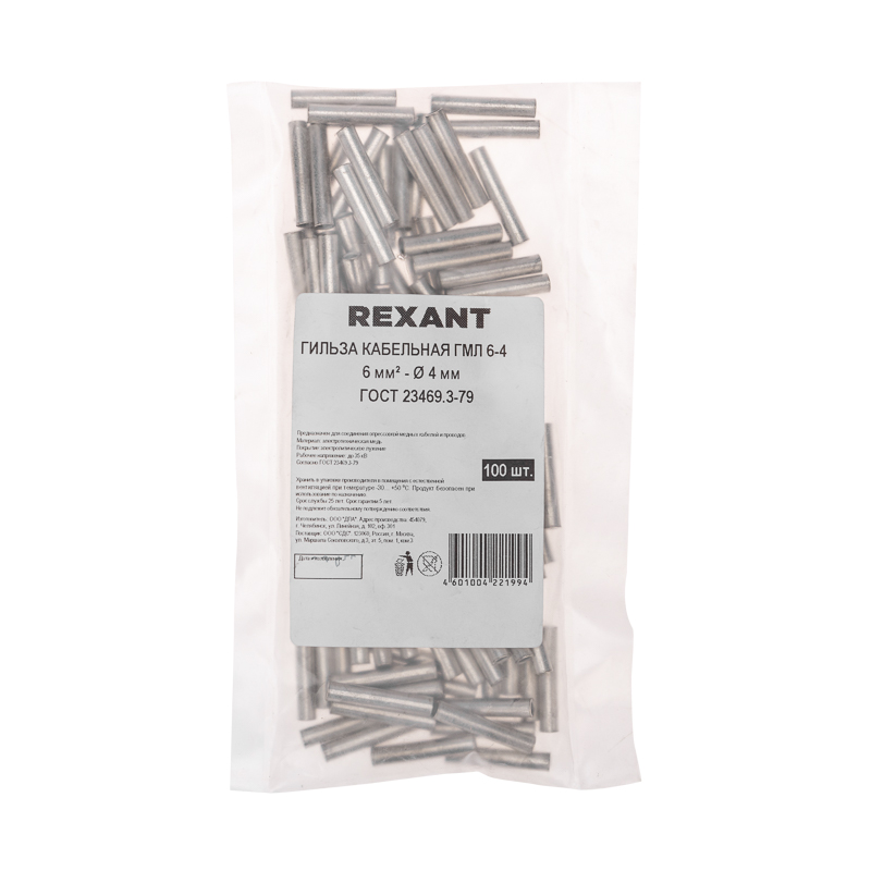 Кабельная гильза ГМЛ 6-4 (6мм² - Ø4мм) REXANT предназначена для оконцовывания посредством опрессовки проводов и кабелей с медными жилами.