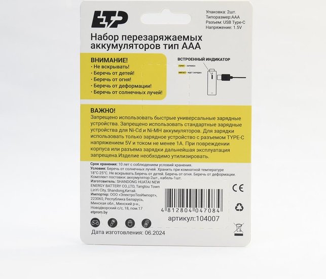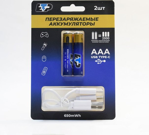 ААА 1.5V + кабель Type-C ETP 650 mAh 2 шт.