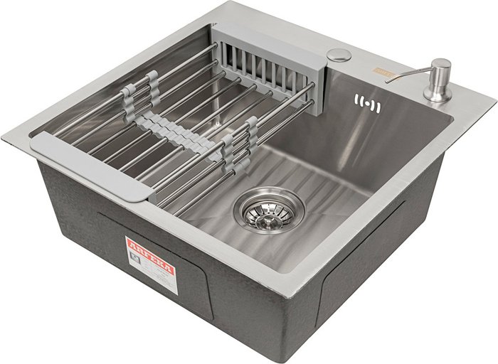 - Комплектация Кухонная мойка, телескопический коландер, дозатор для жидкого мыла, сливная арматура
