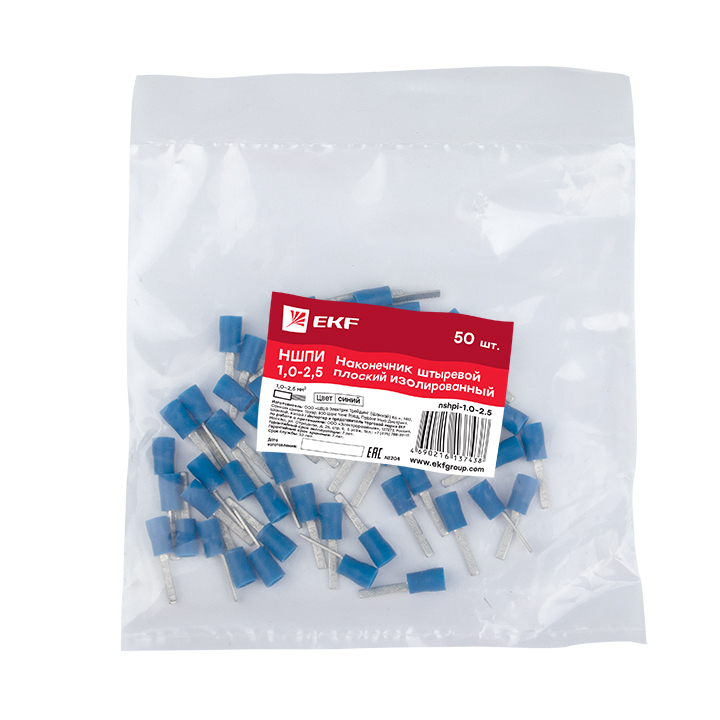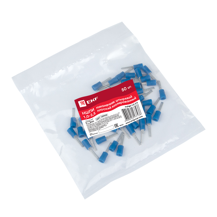 Наконечник штыревой плоский изолированный НШПИ EKF PROxima предназначен для оконцевания опрессовкой медных проводов и последующего крепежа наконечников к электрооборудованию с контактными гнездами штифтового типа (автоматическим выключателям, УЗО, клеммным блокам и т. п.). Опрессовка штыревых плоских изолирующих наконечников выполняется поверх ПВХ манжеты, а не металлической втулки, как у втулочных наконечников.