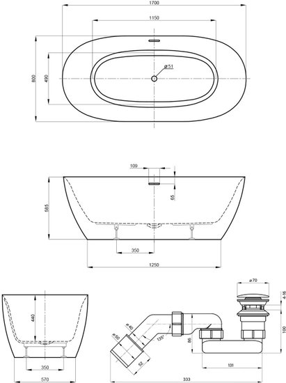 Bliss 170x80 28820103R (отдельностоящая ванна белый глянец, экран, ножки, сифон-автомат матовый черный)