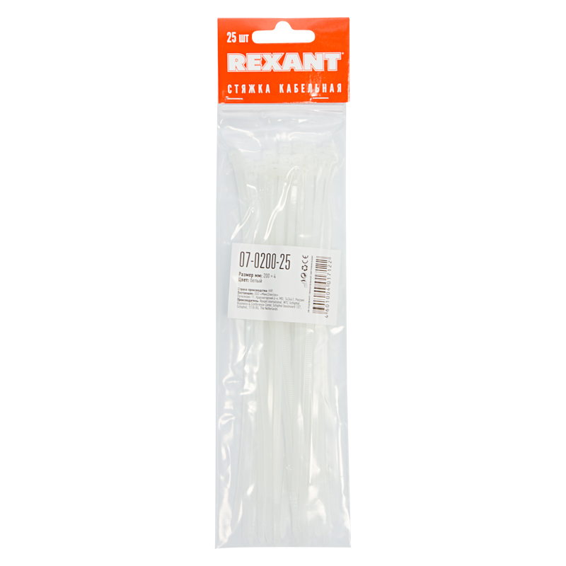 Хомут нейлоновый (кабельная стяжка) 200х3,6 мм белый REXANT предназначен для крепления или обвязки в жгут кабелей и проводов, крепления гибких гофротруб, а также других предметов к несущей поверхности или для соединения между собой. Такая стяжка используется при проведении электромонтажных работ, при монтаже структурированных кабельных систем, для бытовых нужд, а также в других отраслях народного хозяйства. Представляет собой гибкую полоску из нейлона высокой прочности (полиамид-6,6) с замком на конце. Полиамид-6,6 — кристаллизующийся конструкционный материал, имеющий высокую твердость и механическую прочность, отличающийся высокими электроизоляционными свойствами. Простой и удобный монтаж осуществляется вручную следующим образом: большим пальцем левой руки прижать замок к пучку, а правой рукой затягивайте петлю, либо с помощью специального инструмента REXANT арт.12-4521 или 12-4541 (вставить конец затяжки в замок и затянуть до полной фиксации пучка, после чего отрезать выступающую часть бандажа). Не рекомендуется перегибать бандаж при затяжке. Хомуты нейлоновые гарантируют качество, оперативность и экономичность профессионального электромонтажа, обеспечив максимально надежную фиксацию предметов.Основные характеристики:- длина и ширина: 200х3,6 мм- диаметр охвата (максимальный): 53 мм- максимальная рабочая нагрузка: 18 кг- прочность при растяжении: не менее 50 МПа- модуль упругости при растяжении: 8000-11000 МПа;- высокое сопротивление к основаниям, маслам, смазочным материалам, хлоридным растворителям- класс воспламеняемости: UL 94 класс V-2 (самозатухающий)- не содержит галогенов- тип: неразъемные, одноразового использования- температурный диапазон использования: –35...+85 ℃- количество в упаковке: 25 шт.- цвет: белый.