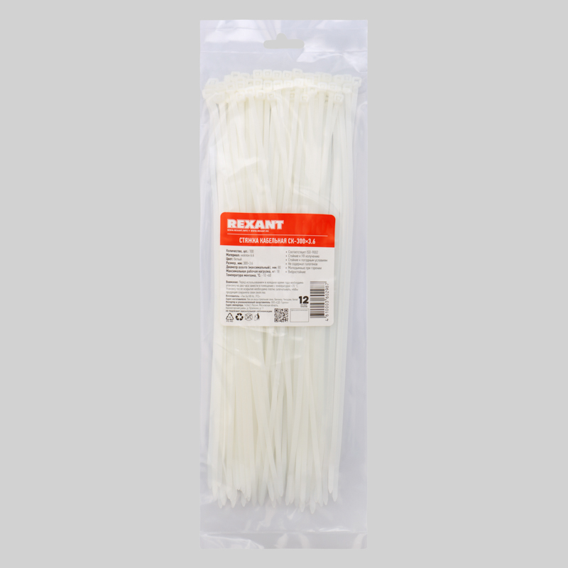Хомут нейлоновый (кабельная стяжка) 300х3,6 мм белый REXANT предназначен для крепления или обвязки в жгут кабелей и проводов, крепления гибких гофротруб, а также других предметов к несущей поверхности или для соединения между собой. Такая стяжка используется при проведении электромонтажных работ, при монтаже структурированных кабельных систем, для бытовых нужд, а также в других отраслях народного хозяйства. Представляет собой гибкую полоску из нейлона высокой прочности (полиамид-6,6) с замком на конце. Полиамид-6,6 — кристаллизующийся конструкционный материал, имеющий высокую твердость и механическую прочность, отличающийся высокими электроизоляционными свойствами. Простой и удобный монтаж осуществляется вручную следующим образом: большим пальцем левой руки прижать замок к пучку, а правой рукой затягивайте петлю, либо с помощью специального инструмента REXANT арт.12-4521 или 12-4541 (вставить конец затяжки в замок и затянуть до полной фиксации пучка, после чего отрезать выступающую часть бандажа). Не рекомендуется перегибать бандаж при затяжке. Хомуты нейлоновые гарантируют качество, оперативность и экономичность профессионального электромонтажа, обеспечив максимально надежную фиксацию предметов.Основные характеристики:- длина и ширина: 300х3,6 мм- диаметр охвата (максимальный): 80 мм- максимальная рабочая нагрузка: 18 кг- прочность при растяжении: не менее 50 МПа- модуль упругости при растяжении: 8000-11000 МПа- высокое сопротивление к основаниям, маслам, смазочным материалам, хлоридным растворителям- класс воспламеняемости: UL 94 класс V-2 (самозатухающий)- не содержит галогенов- тип: неразъемные, одноразового использования- температурный диапазон использования: –35...+85 ℃- количество в упаковке: 100 шт.- цвет: белый.