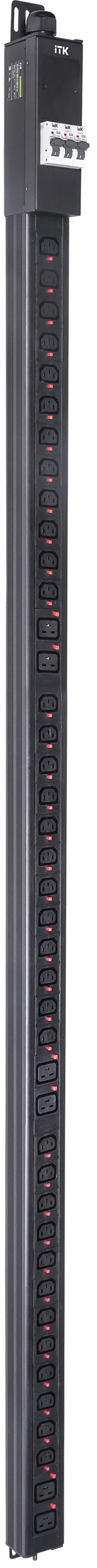 Вертикальный комбинированный блок распределения питания PDU ITK включает в себя розетки двух типов: 36 розеток C13 и 6 розеток C19 – что позволяет подключать с их помощью различное оборудование. PDU ITK изготавливается из высококачественных термостойких материалов и пластмасс, оснащается 3-х метровым кабелем электропитания с вилкой промышленного назначения IEC60309. PDU ITK прекрасно справляется с задачей по электроснабжению сетевого оборудования в шкафах и стойках, а также с требованием защиты от токов короткого замыкания и перенапряжения. PDU ITK соответствует российским и международным стандартам качества и устанавливается с помощью кронштейнов, при этом положение кронштейнов можно менять, либо безынструментальным методом при помощи монтажных штифтов.