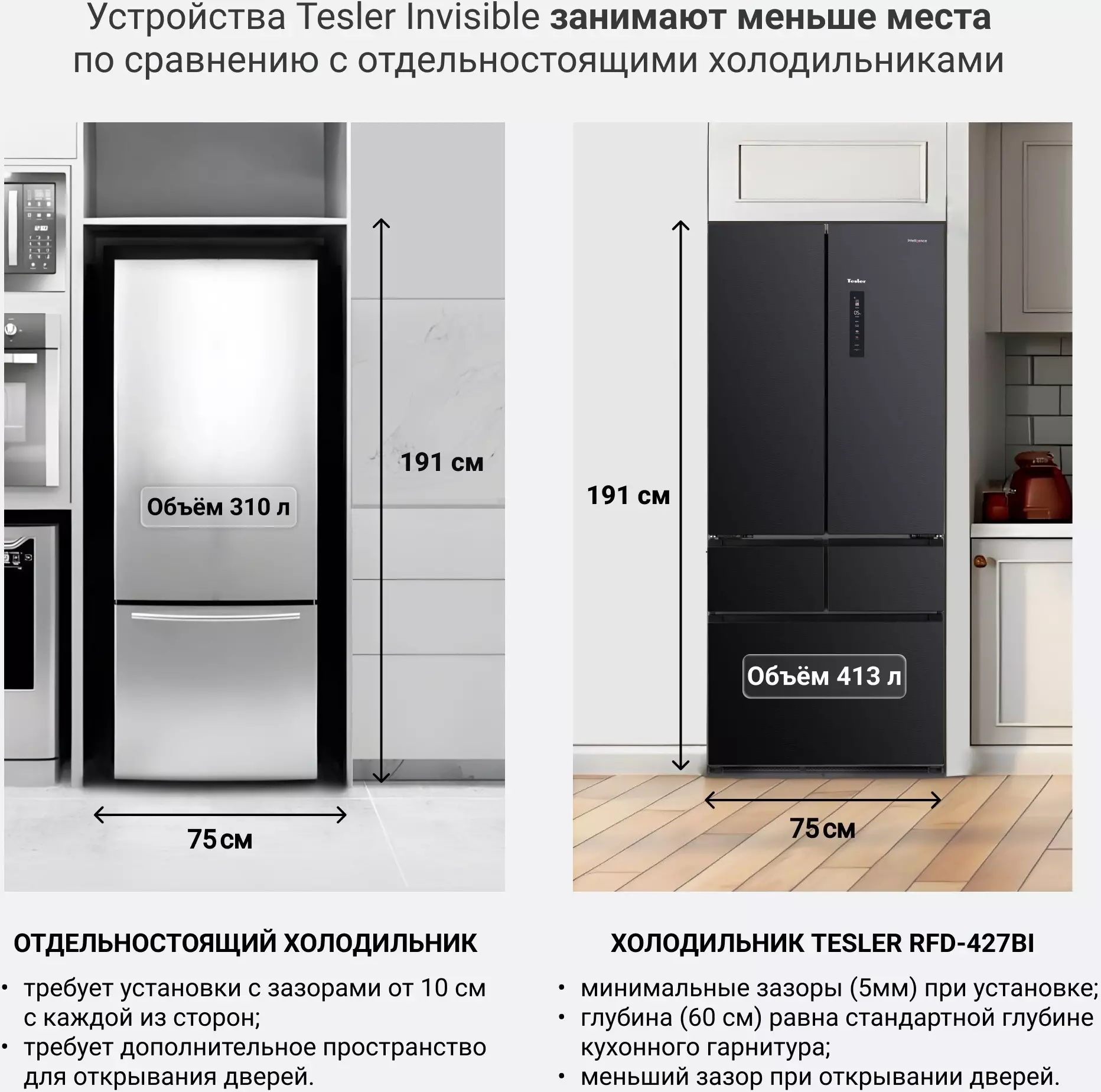 ОсобенностиСовмещает преимущества отдельно стоящих и встраиваемых холодильников