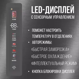 Особенности морозильной камерыМорозильное отделение делят на три части 3 выдвижных ящика, что помогает предотвратить потери холода при открывании. Если нужно заморозить большой объём продуктов — поможет функция «Быстрая заморозка», которая установит в морозильной камере температуру -28°С на 24 часа.