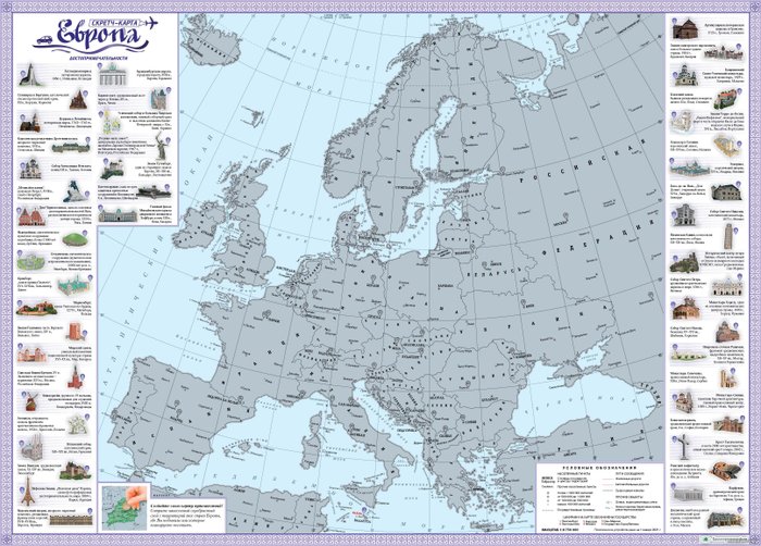 - На карте под тонким серебристым слоем, который легко стирается, к примеру, монеткой, находится политическая карта Европы: указаны названия стран, столицы, крупные города, автомобильные и железные дороги, судоходные каналы. Отдельно на карте отмечены места расположения самых знаковых, необычных и интересных достопримечательностей европейских стран. Их изображения и краткие описания находятся на полях карты. На карте под тонким серебристым слоем, который легко стирается, к примеру, монеткой, находится политическая карта Европы: указаны названия стран, столицы, крупные города, автомобильные и железные дороги, судоходные каналы. Отдельно на карте отмечены места расположения самых знаковых, необычных и интересных достопримечательностей европейских стран. Их изображения и краткие описания находятся на полях карты.