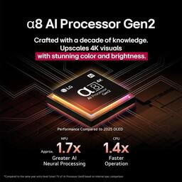 ✅ Умный и быстрый ИИ-процессор alpha 8 Gen2Созданный на основе десятилетия инноваций, процессор alpha 8 Gen2 от LG обладает улучшенной производительностью, способной распознавать жанр контента и настраивать оптимальное качество изображения. Это обеспечивает потрясающее 4K-разрешение с насыщенными цветами, глубиной и четкостью.✅ Процессор alpha 8 Gen2 на 1,7 раза производительнее по нейронной ИИ-обработке и на 1,4 раза быстрее по работе CPU по сравнению с alpha 7 Gen8 (данные LG)✅ Идеальный черный OLED от LGТехнология LG OLED с сертификацией UL обеспечивает «Идеальный черный» даже в сложных условиях освещенности. Это позволяет достичь высочайшего контраста и яркости, сохраняя насыщенные детали в самых темных сценах.*Проверено UL: уровень черного < 0,24 нита при освещенности до 500 Лк.✅ Сертифицированная точность и объем цветаOLED-дисплеи LG сертифицированы Intertek и UL по 100% объему и точности цветопередачи по стандарту DCI-P3. Благодаря антибликовому покрытию изображение остаётся четким даже при ярком освещении.*Сертификаты по CIE DE2000 (125 шаблонов) и IDMS 11.5. Подтверждено независимыми испытаниями.✅ AI Picture Pro: совершенство в деталяхФункция AI Super Upscaling и OLED Dynamic Tone Mapping Pro анализируют каждый кадр, улучшая разрешение, глубину и цветовой баланс. Это обеспечивает реалистичную передачу объектов и текстур.*Не применяется к авторски защищённому контенту из OTT-сервисов.✅ Расширенные возможности с AI TVПульт LG AI Magic Remote предоставляет интуитивное управление: указывайте, прокручивайте, говорите — и телевизор отреагирует. AI Voice ID распознаёт пользователей по голосу, а встроенные сервисы, включая AI Concierge, Picture/Sound Wizard, Chatbot и Search, персонализируют ваш опыт.*Функции зависят от региона и модели. Требуется подключение к Интернету.✅ Простое управление домом с Home HubИнтеграция с устройствами LG ThinQ, Google Home и поддержка Matter позволяют управлять всей умной техникой из одного центра — прямо с экрана телевизора.✅ Объёмный звук с AI Sound Pro и WOW OrchestraПогрузитесь в 9.1.2-канальный виртуальный звук, адаптированный с помощью AI. Технологии AI Clear Sound и Dynamic Sound Booster выделяют каждый голос и аудиодеталь. В синергии с LG Soundbar вы получаете максимальное аудио-впечатление через интерфейс WOW Interface.*Совместимость и доступность функций зависят от модели телевизора и региона.✅ Модернизация программного обеспечения с webOS Re:NewВ течение 5 лет телевизоры LG получают 4 полных обновления webOS с новыми функциями и улучшенной безопасностью. Программа отмечена наградой CES Innovation в категории кибербезопасности.✅ Расширенные возможности развлеченийИспользуйте Multi View для одновременного просмотра контента с двух источников. Игровой портал LG поддерживает GeForce NOW, Luna, Boosteroid и другие сервисы, включая AAA-игры. Поддержка VRR, G-Sync, FreeSync и Dolby Vision гарантирует плавный игровой процесс.✅ Режим Ambient FILMMAKER и Dolby VisionПогрузитесь в атмосферу кино с режимом Ambient FILMMAKER, адаптирующим изображение к освещению комнаты. Dolby Atmos усиливает эффект присутствия благодаря объемному звуку.✅ Умный и быстрый ИИ-процессор alpha 8 Gen2Созданный на основе десятилетия инноваций, процессор alpha 8 Gen2 от LG обладает улучшенной производительностью, способной распознавать жанр контента и настраивать оптимальное качество изображения. Это обеспечивает потрясающее 4K-разрешение с насыщенными цветами, глубиной и четкостью.✅ Процессор alpha 8 Gen2 на 1,7 раза производительнее по нейронной ИИ-обработке и на 1,