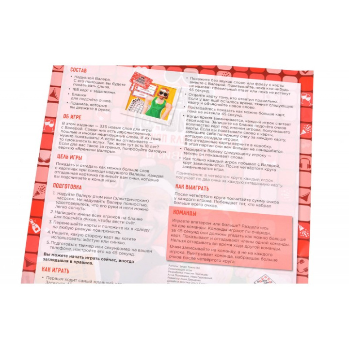 "Не время для приличий!" - это взрывная игра для взрослых компаний, где вам предстоит объяснять двусмысленные и откровенные слова с помощью жестов и надувного Валеры. Чем креативнее вы используете реквизит, тем больше смеха и неловких ситуаций!