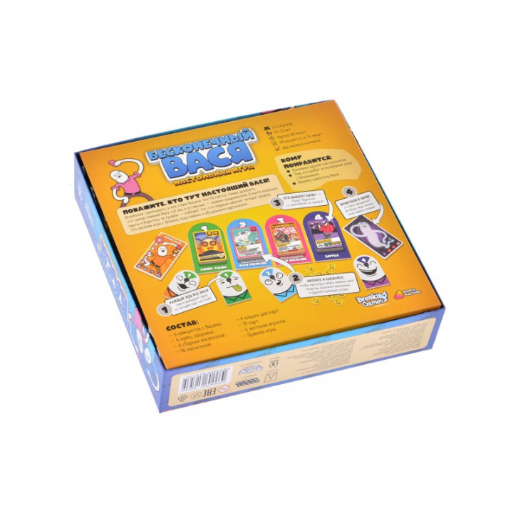Настольная карточная игра "Бесконечный Вася" погружает вас в безумный мир, где все люди стали Васями. Кто же из вас истинный Вася, а кто лишь подражатель? Блеф и хитрость станут вашими верными спутниками в этой веселой и захватывающей игре. Присоединяйтесь к битве, зарабатывайте трофеи и станьте настоящим победителем в этой уникальной вечеринке для компании!