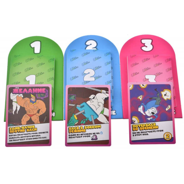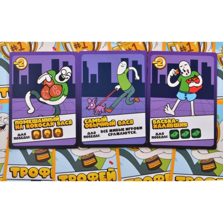 В игре "Бесконечный Вася" каждый игрок выбирает одну из четырёх карт в тайне от других. Ваша цель – собрать карты с полезными бонусами и заработать трофеи в борьбе со злыми Васями. Игрок, который первым наберёт 4 трофея, объявляется победителем. Если вы стали призраком, не отчаивайтесь — у вас есть возможность "насолить" живым Васям!