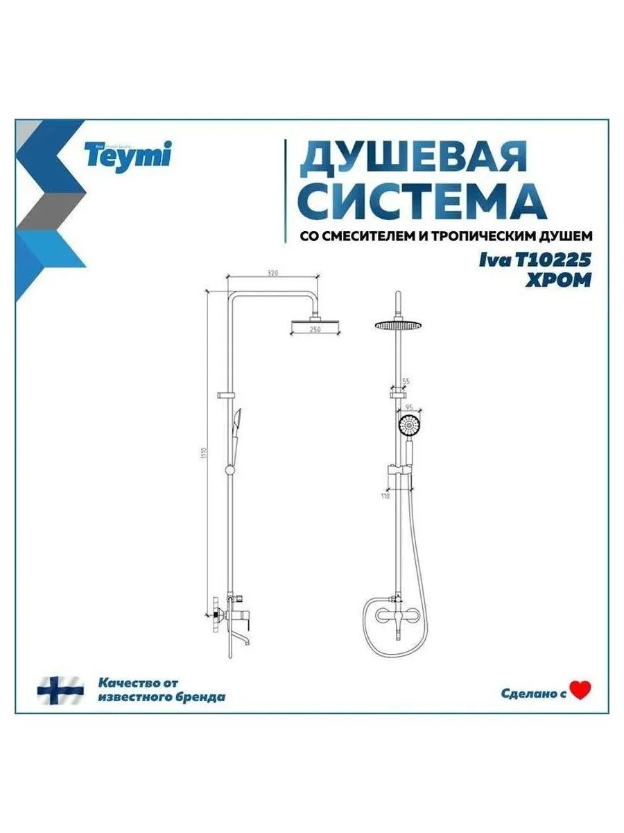 Душевая система Teymi Iva с однорычажным смесителем и тропическим душем это стильное и функциональное решение для вашей ванной комнаты. Верхний душ обеспечивает эффект тропического дождя, создавая ощущение спа у вас дома. Высота штанги составляет 1110 мм, что удобно для пользователей разного роста. Корпус выполнен из нержавеющей стали с хромированным покрытием, что гарантирует долговечность и современный внешний вид. Керамический картридж обеспечивает плавную и надежную работу смесителя. Продукция бренда Teymi производится в Финляндии, отличается высоким качеством и соответствует европейским стандартам. В комплекте всё необходимое для быстрой установки. Идеальный выбор для тех, кто ценит комфорт, надежность и стиль в каждой детали ванной комнаты