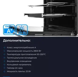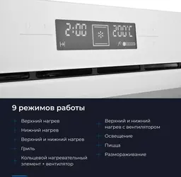 Режимы духовкиВерхний нагрев, Нижний нагрев, Верхний и нижний нагрев, Гриль, Кольцевой нагревательный элемент + вентилятор, Верхний и нижний нагрев с вентилятором, Гриль с конвекцией, Режим Пицца, Размораживание