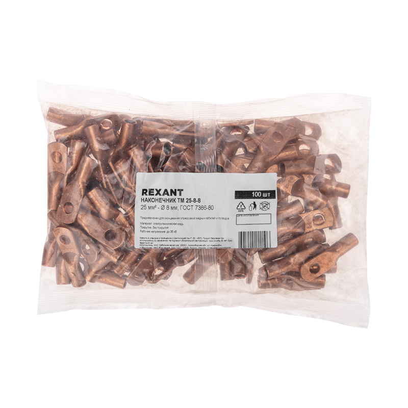 Наконечник ТМ 25-8-8 (25мм² - Ø8мм) REXANT предназначен для оконцевания опрессовкой медных кабелей и проводов.
