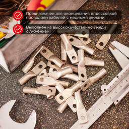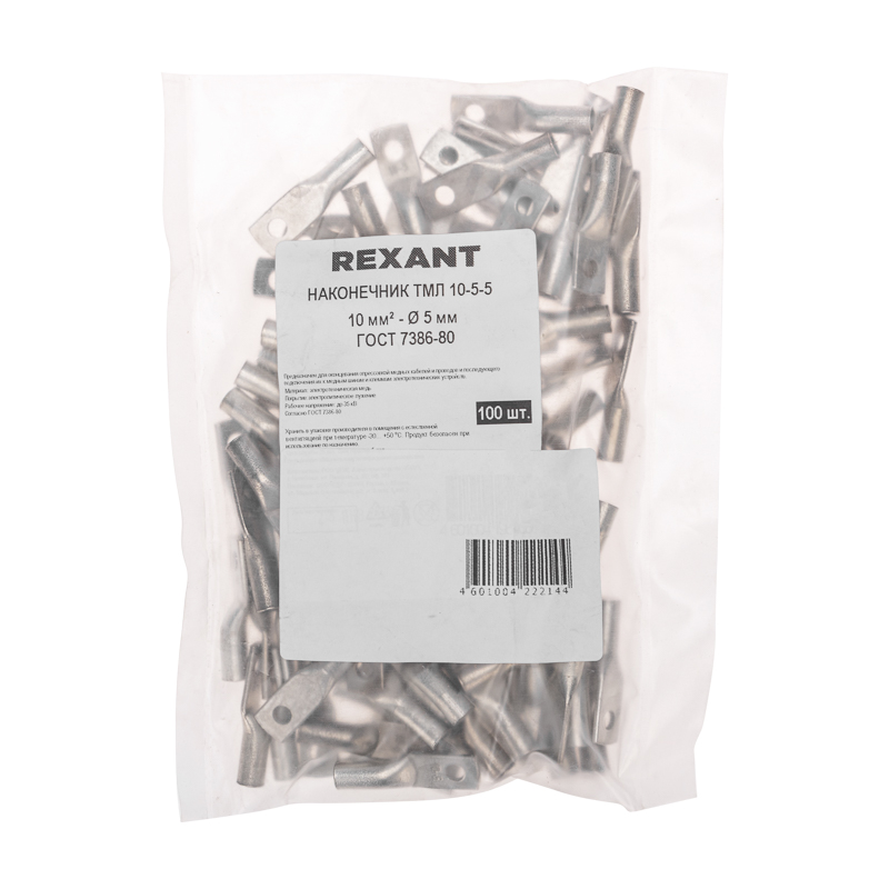 Наконечник ТМЛ 10-10-5 (10мм² - Ø5мм) REXANT предназначен для оконцевания проводов и кабелей с медными и алюминиевыми жилами посредством опрессовки для последующего болтового соединения проводника с оборудованием или шиной.