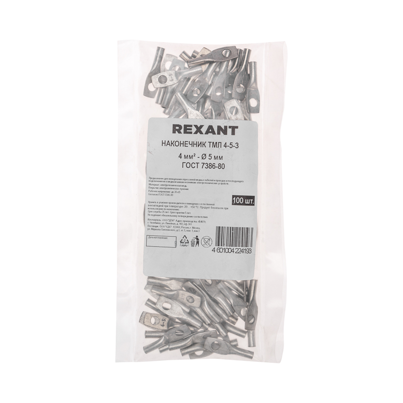 Наконечник ТМЛ 4–5–3 (4мм² - Ø5мм) REXANT предназначен для оконцевания проводов и кабелей с медными и алюминиевыми жилами посредством опрессовки для последующего болтового соединения проводника с оборудованием или шиной.