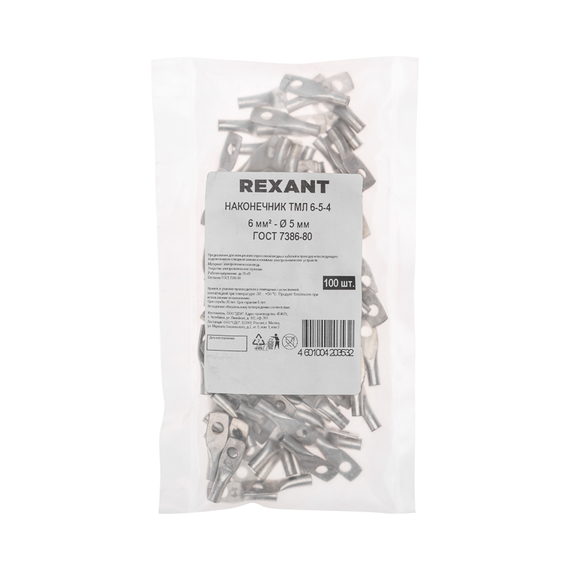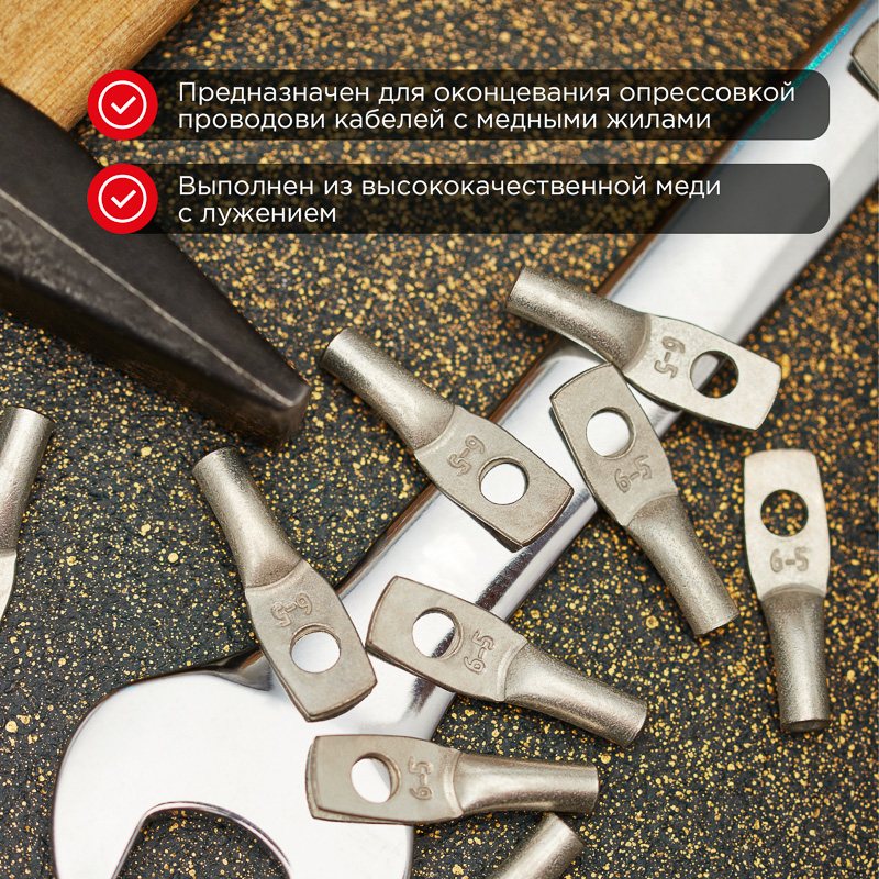 Наконечник ТМЛ 6–5–4 (6мм² - Ø5мм) REXANT предназначен для оконцевания проводов и кабелей с медными и алюминиевыми жилами посредством опрессовки для последующего болтового соединения проводника с оборудованием или шиной.