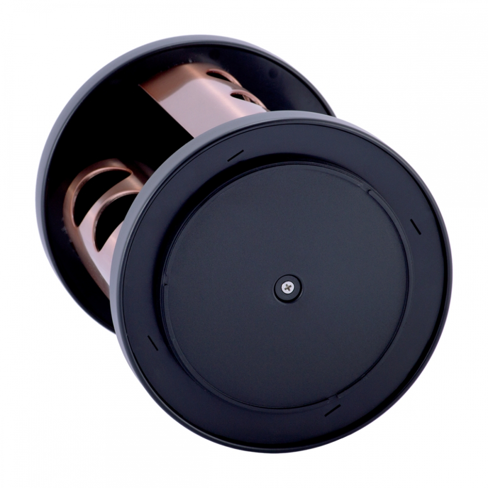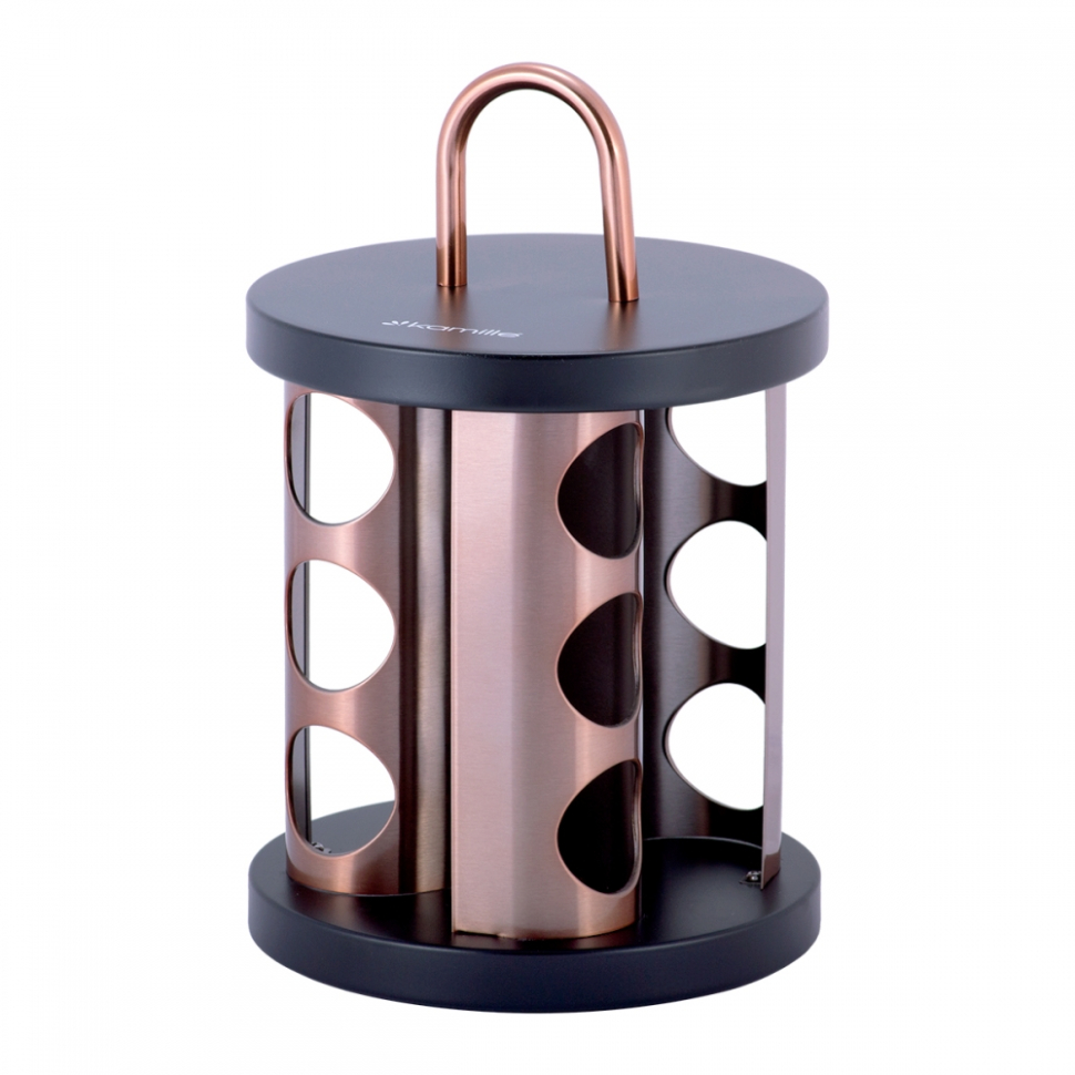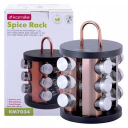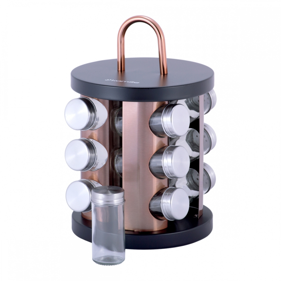 Заводская упаковка нарушена или отсутствует. Товар НОВЫЙ, в полной комплектации. / Набор ёмкостей для специй на круглой подставке с ручкой. Размер подставки: 22*19*19см, высота ручки: 7,5см. Количество емкостей в наборе: 12 шт. Высота емкости: 9,5см. Диаметр емкости: 4см. Объем емкости: 100мл. Материал: нержавеющая сталь, стекло. Цвет: матовое покрытие черное с медным. Упаковка: цветная картонная коробка 29,5*19,5*19,5см.