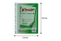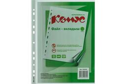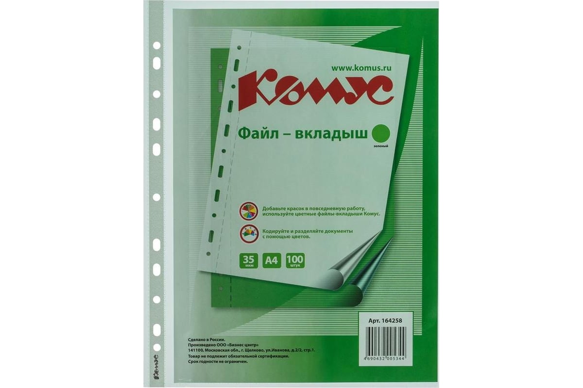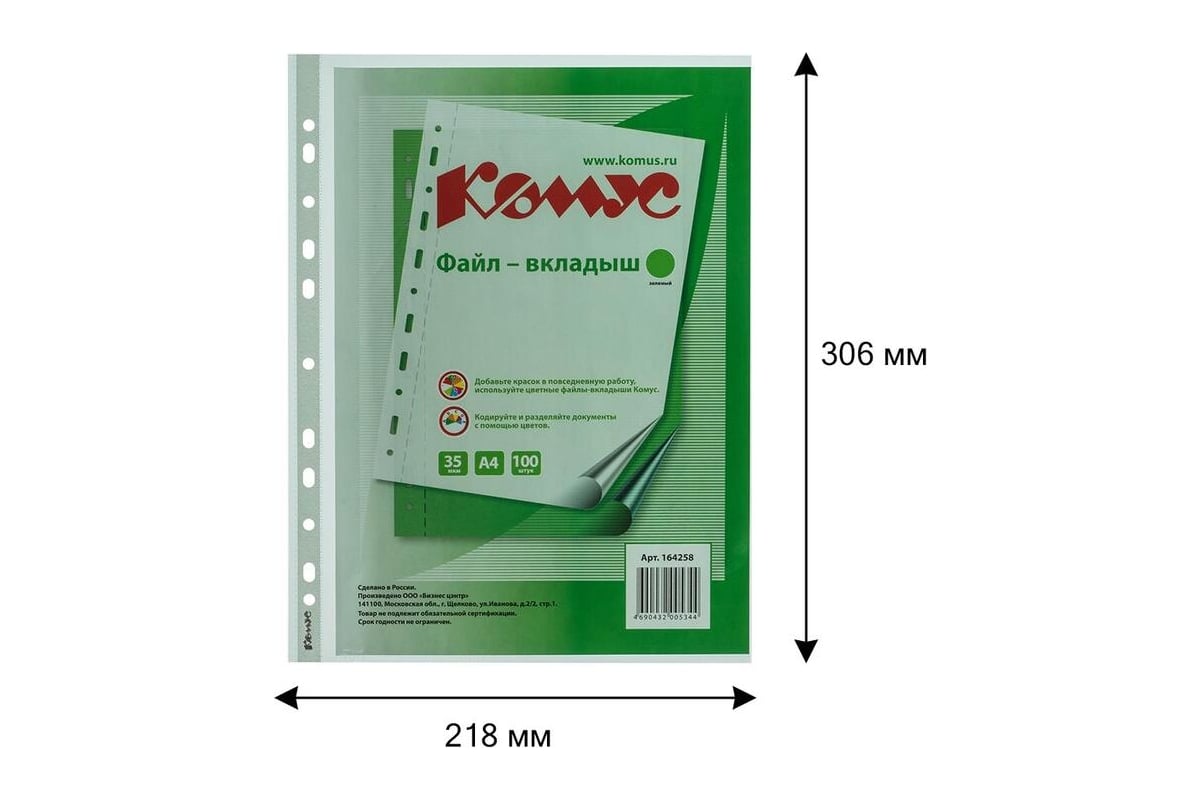 Файл-вкладыш Комус формата А4 предназначен для хранения и защиты документов. Изготовлен из полипропиленовой пленки зеленого цвета (толщина 35 мкм). Внутренний размер 306×218 мм. Имеет прозрачную рифлёную поверхность. Боковая универсальная перфорация подходит для разных типов скоросшивателей. В упаковке содержится 100 файлов. Каждый файл-вкладыш вмещает до 50 листов стандартной плотности.
