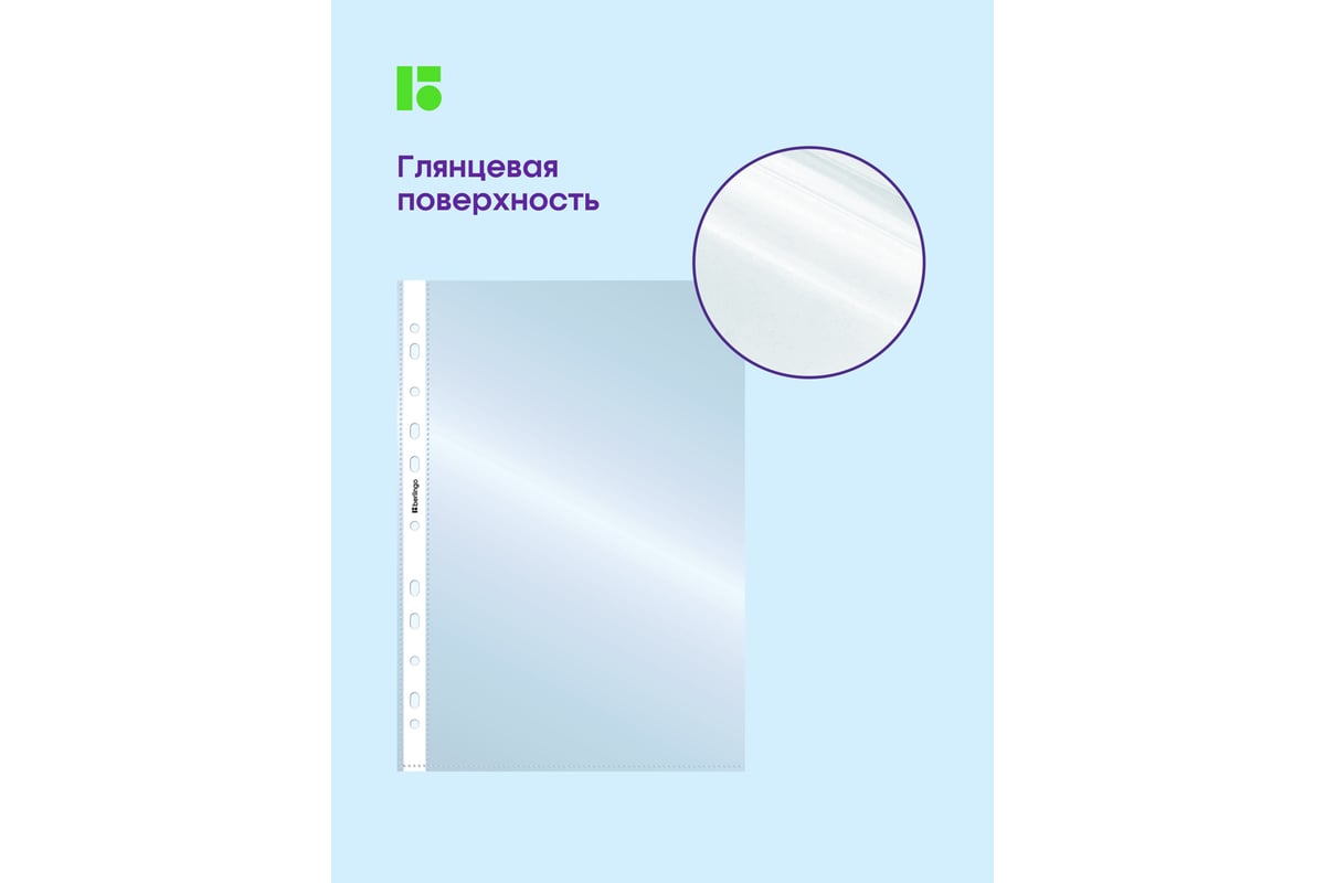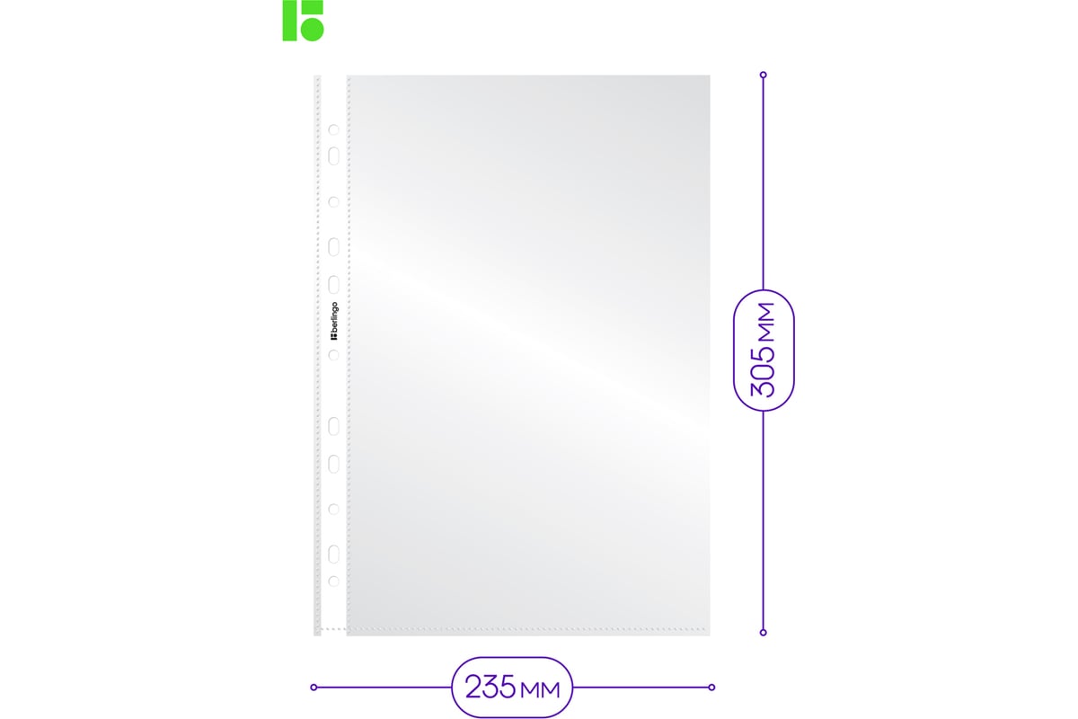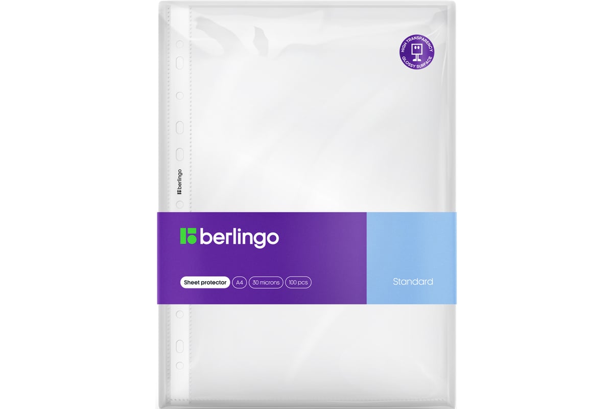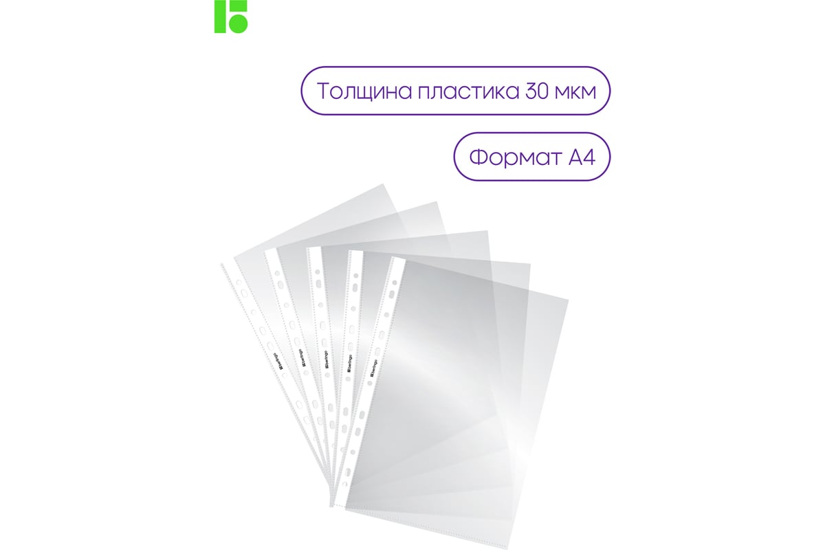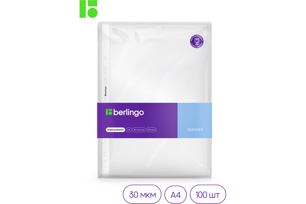 Папка-вкладыш Berlingo с перфорацией, А4, 30 мкм, глянцевая S1000 - глянцевые прозрачные файлы-вкладыши Berlingo формата А4 размера 305х235 мм имеют универсальную перфорацию для хранения документов формата А4 в любых папках и защиты листов от внешних воздействий. Вертикальная ориентация, толщина пленки 30 мкм, вместимость файла до 50 листов бумаги. В упаковке 100 штук. Логотип бренда на боковой ленте.