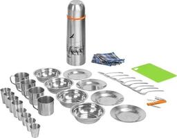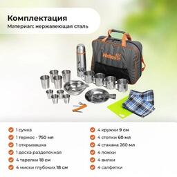 • Состав набора • 1 сумка• 1 термос 750мл• 1 открывашка• 1 доска разделочная• 4 тарелки 18см• 4 миски глубоких 18см• 4 кружки 9см• 4 стакана 260мл• 4 ложки• 4 вилки• 4 стопки• 4 салфетки