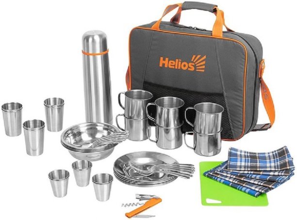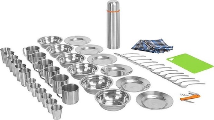 - Состав набора • 1 сумка• 1 термос 750мл• 1 открывашка• 1 доска разделочная• 6 тарелок 18см• 6 мисок глубоких 18см• 6 кружек 9см• 6 стаканов 260мл• 6 ложек• 6 вилкок• 6 стопок• 6 салфеток