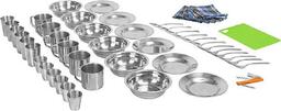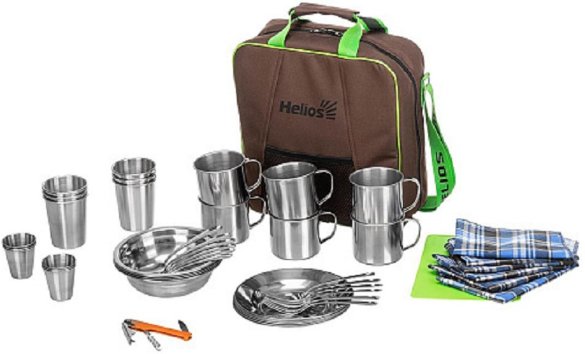 • Состав набора 1 сумка • 1 открывашка • 1 доска разделочная • 6 тарелок 18см • 6 мисок глубоких 18см • 6 кружек 9см • 6 стаканов 260мл • 6 ложек • 6 вилок • 6 стопок • 6 салфеток. Размер: 30*13*32.