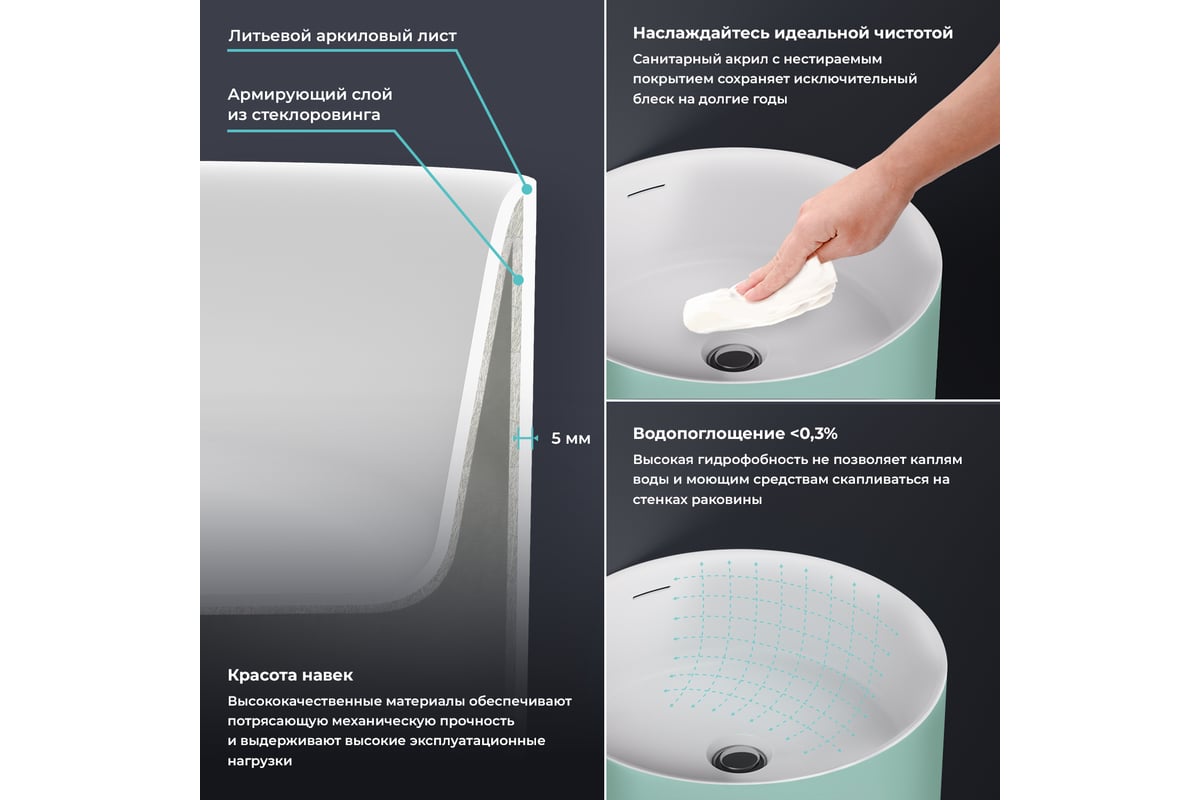 Ультрагладкая акриловая поверхность с идеальной полировкой и фирменным антибактериальным покрытием устойчива к загрязнениям, красителям и не впитывает запахов