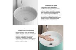 Коллекция напольных раковин представлена моделями диаметром 45 см. Оптимальная форма и глубина круглой чаши обеспечат комфорт водных процедур. Природное отражение в мягких обтекаемых формах и оттенках коллекции дополняется монолитностью и отсутствием технологических швов, что облегчает процесс ухода за изделием.