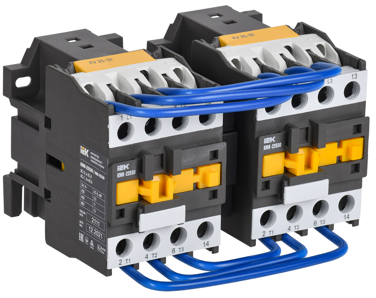 Контакторы КМИ (реверс) IEK используются для пуска, остановки и реверсирования асинхронных электродвигателей, а также для дистанционного управления цепями освещения, нагревательными цепями и различными малоиндуктивными нагрузками (категория применения АС-1). Поставляются с заводскими шинами и механической блокировкой.