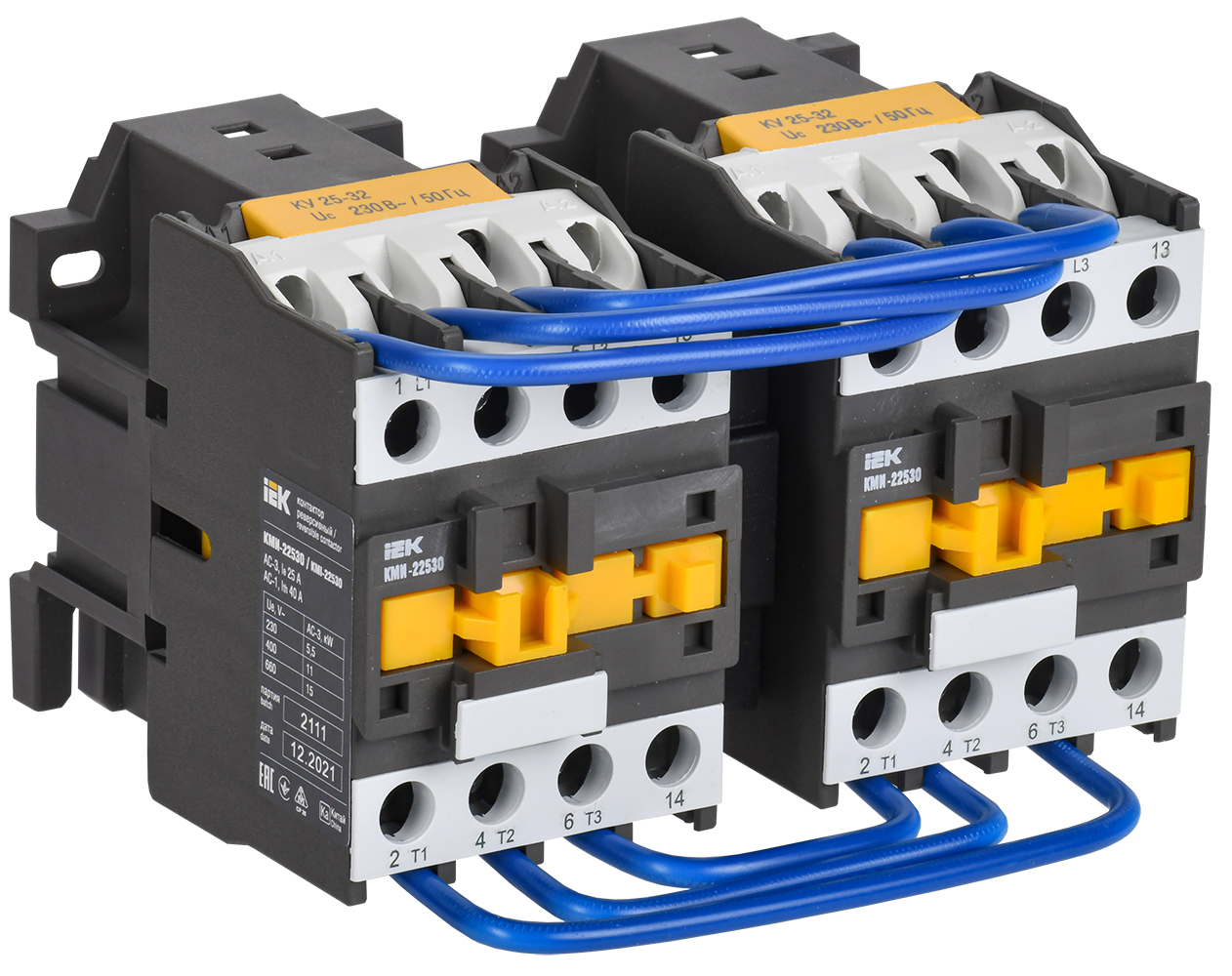 Контакторы КМИ (реверс) IEK используются для пуска, остановки и реверсирования асинхронных электродвигателей, а также для дистанционного управления цепями освещения, нагревательными цепями и различными малоиндуктивными нагрузками (категория применения АС-1). Поставляются с заводскими шинами и механической блокировкой.