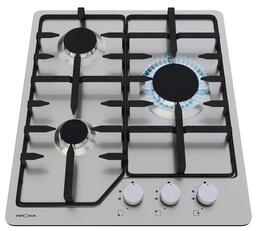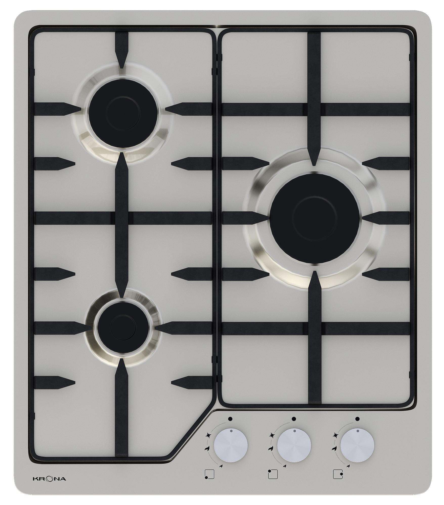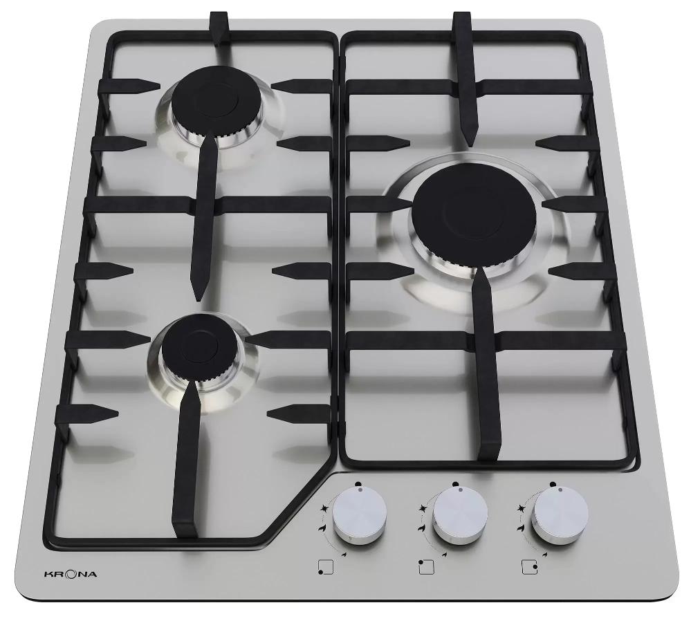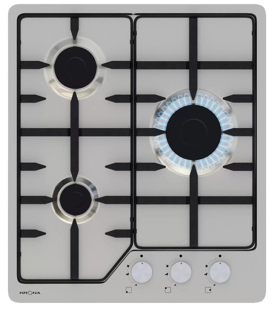 Выбор газовой варочной панели чаще всего обусловлен тем, что в частный дом или квартиру проведен именно газ в качестве обогрева. Работать с этой моделью довольно просто, так как мощность нагрева видна невооруженным взглядом — по силе огня в горелке. Количество конфорок в этой модели: 3.