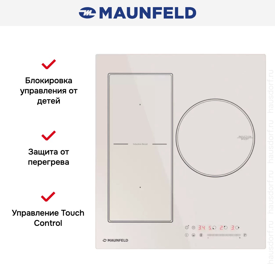 Варочная панель работает на индукционном нагреве — это значит, что повышается температура непосредственно посуды, в которой готовится блюдо. Таким образом промежуточная ступень с предварительным нагревом конфорки пропускается — сокращается время, повышается безопасность. Количество конфорок в этой модели: 3.